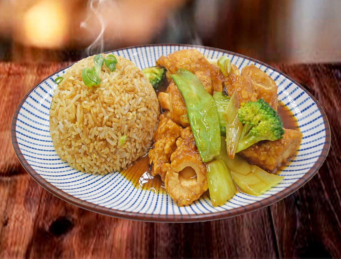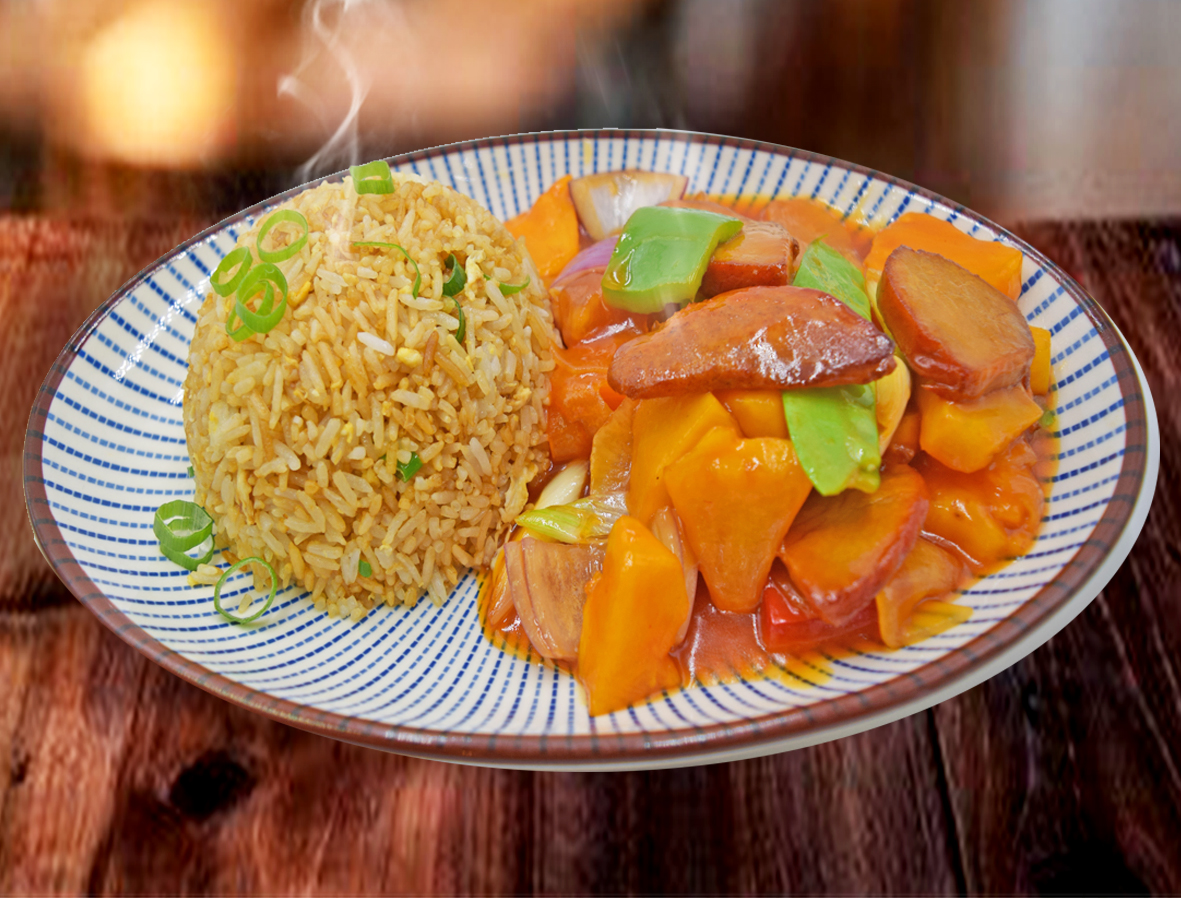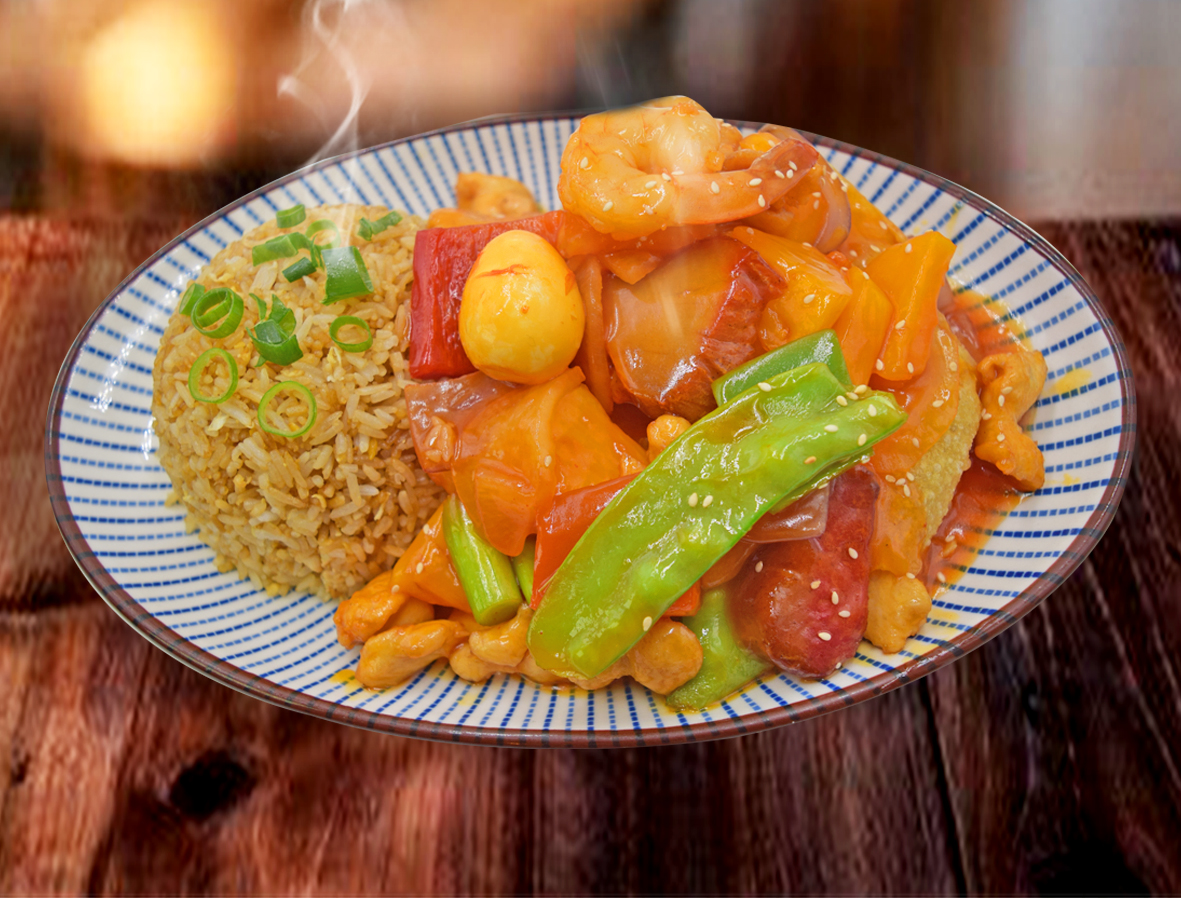 2. Hermoso plato salteado al wok con una mezcla de verduras, huevo de cordoniz, pato, langostino, cerdo asado y pollo (agridulce) más conocido como nuestro