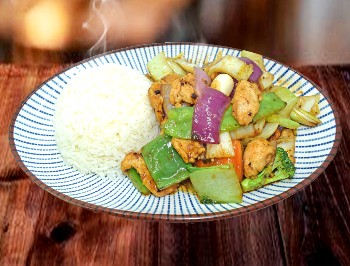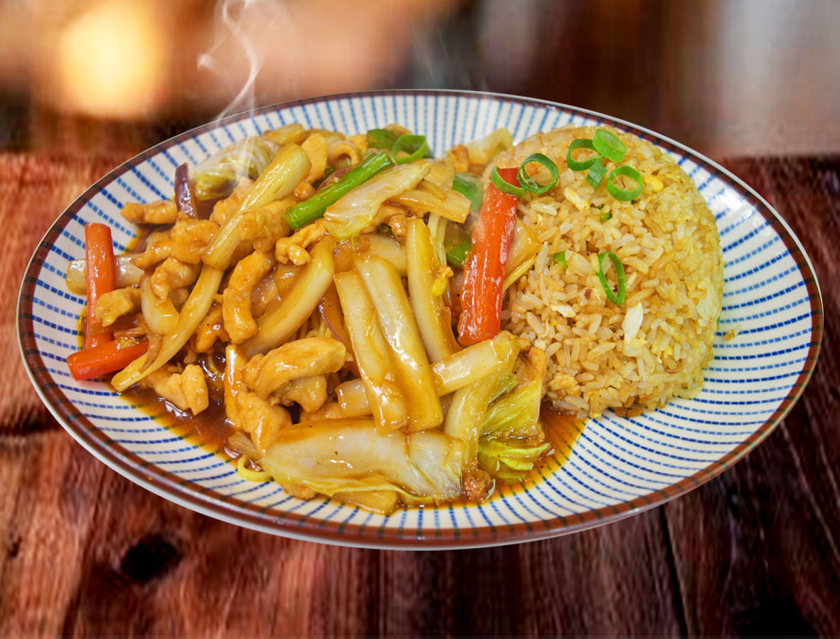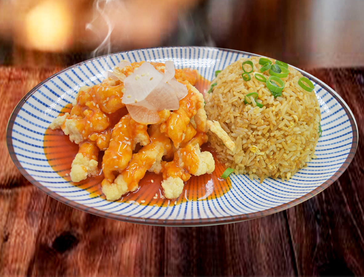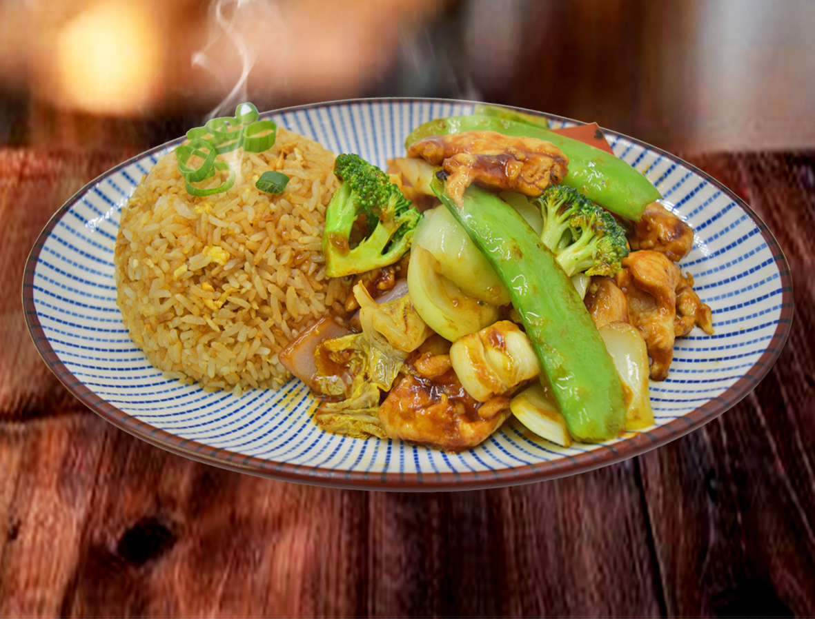 2. Hermoso plato salteado al wok con una mezcla de verduras, huevo de cordoniz, pato, langostino, cerdo asado y pollo (agridulce) más conocido como nuestro