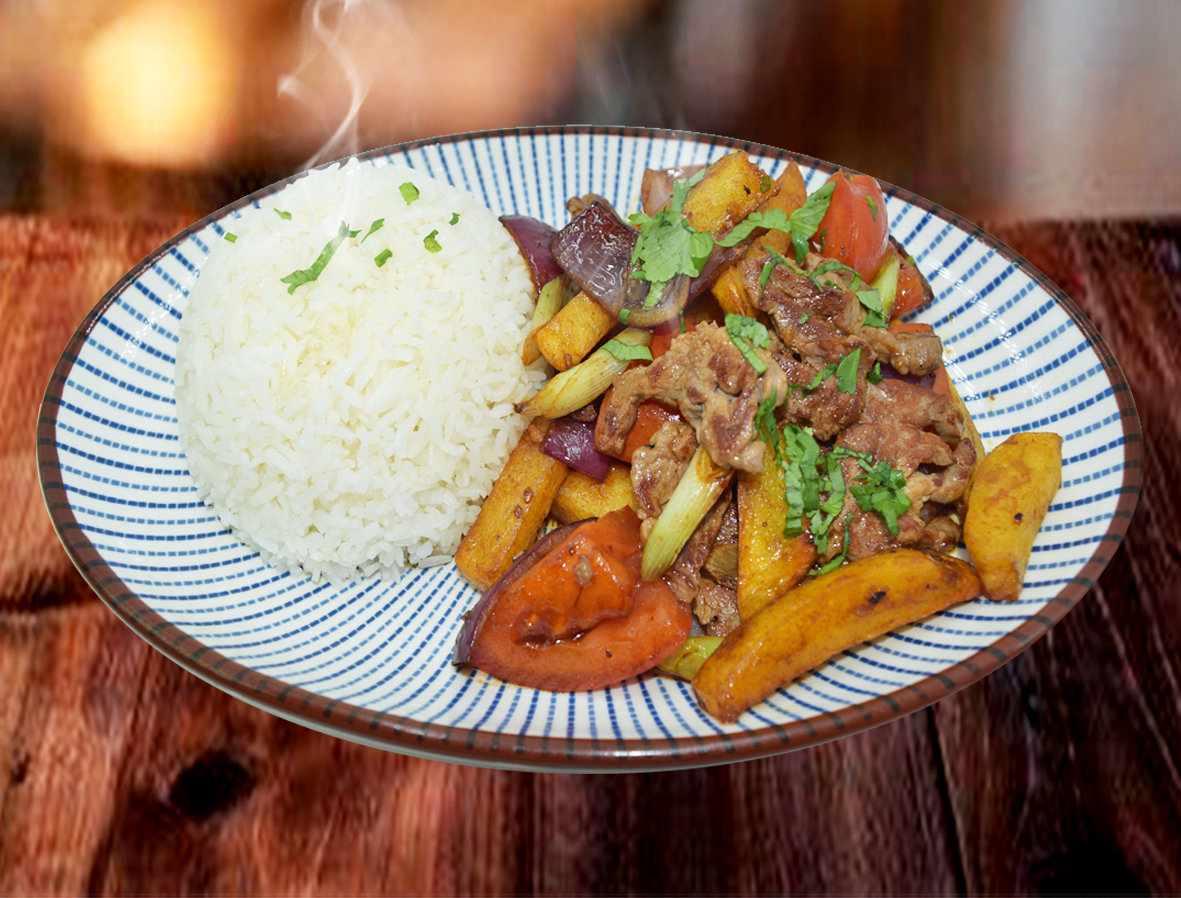cebolla, ají amarillo, cilantro y lomo de vaca.